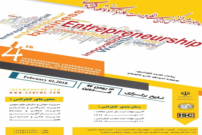 چهارمین کنفرانس بین المللی مدیریت، کارآفرینی و توسعه اقتصادی توسط موسسه آموزش عالی تاکستان برگزار می شود.