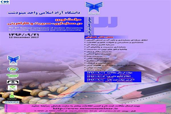 سومین همایش ملی مباحث نوین در حسابداری، مدیریت و کارآفرینی در تاریخ ۲۹ آذر ۱۳۹۶ توسط دانشگاه آزاد اسلامی واحد مینودشت برگزار می شود.