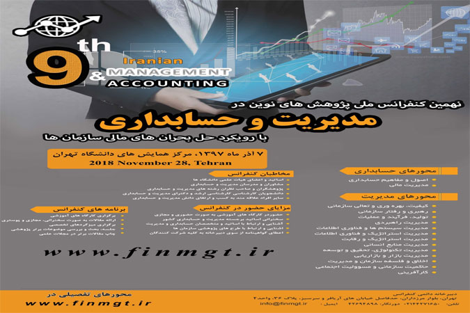 نهمین کنفرانس ملی پژوهش های نوین در مدیریت و حسابداری با رویکرد حل بحرانهای مالی سازمان ها در تاریخ 7 آذر سال 1397 در مرکز همایش های دانشگاه تهران برگزار می شود.